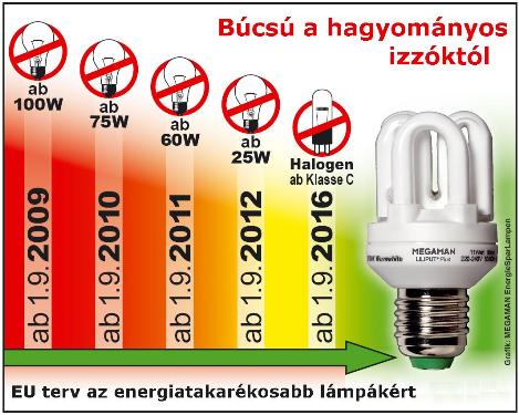 2008. december 9. A terv, amely hétfőn Brüsszelben elfogadásra került, beszünteti a hagyományos izzókat és halogén fényforrásokat az EU területén, melyet több fokozatban hajtanak végre az energiatakarékos, halogén energiatakarékos és LED fényforrások javára. Ami a rendeletet illeti első sorban a kis és nagy foglalatú (E14/E27) fényforrásokat kezeli. A speciális izzók, mint pl. a hűtőszekrényekben, sütőkben és az infravörös világítás, nem lesznek tíltva. A reflektor vagy spot izzókat 2009-ben külön szabályozzák.
