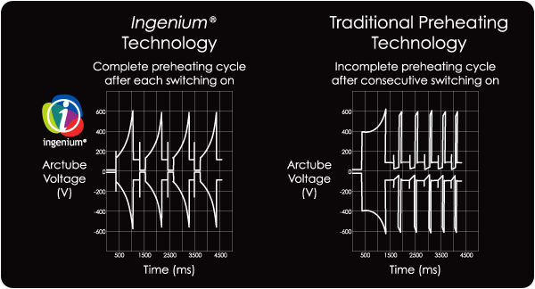Mikor összehasonlítjuk az energiatakarékos fényforrásokat láthatjuk, hogy a hagyományos előmelegítési mechanizmust alkalmazó fényforrásokkal szemben a MEGAMAN® INGENIUM® technológiával ellátott termékeinél sokkal jobb kontrolt és sokkal rövidebb, 1 másodpercen belűli előmelegítési időt tapasztalhatunk. Ez kiküszöböli az izzószál meghibásodásást, valamint meghosszabbítja a fényforrás várható élettartamát.